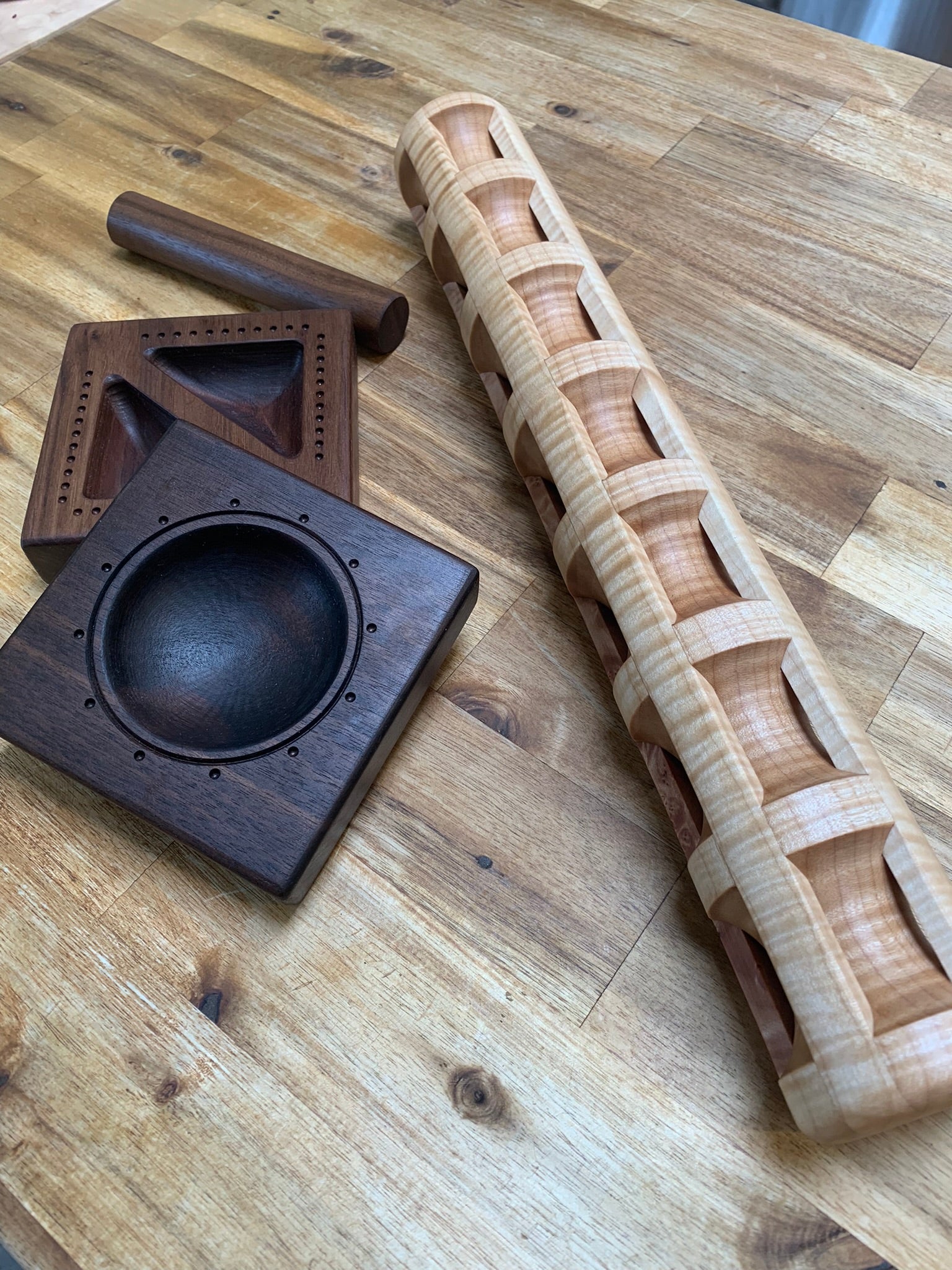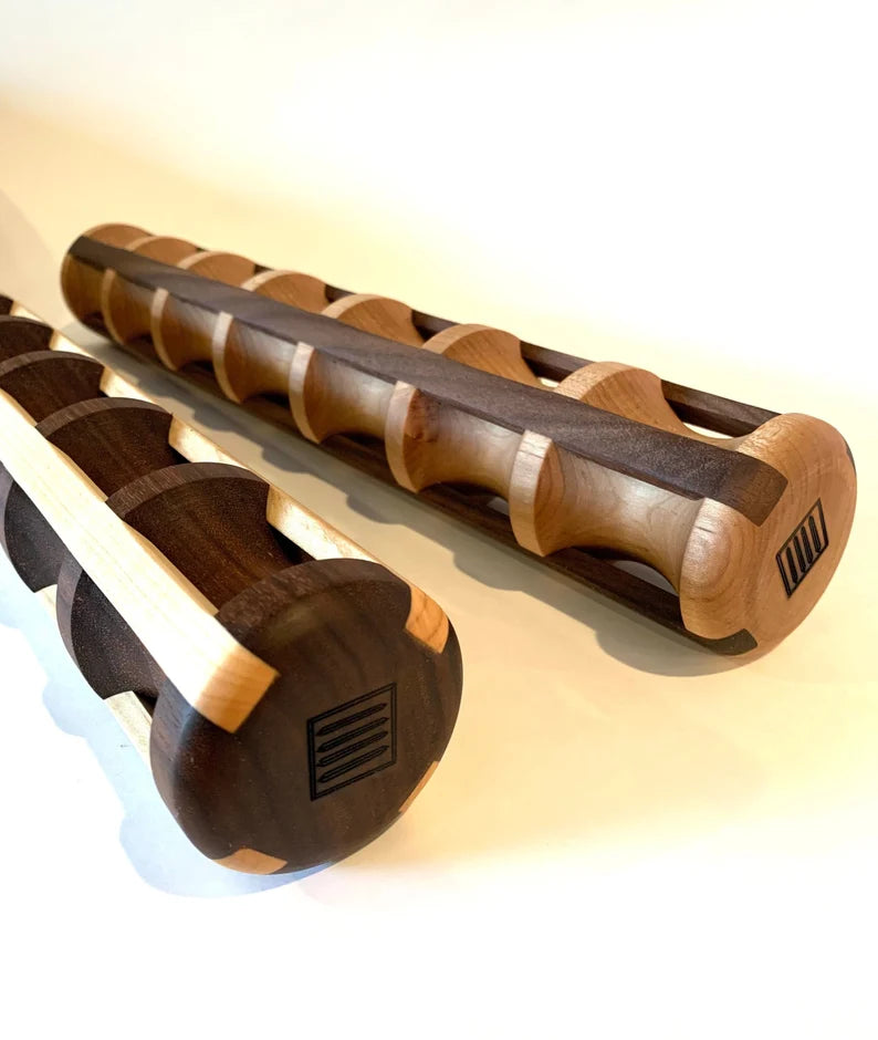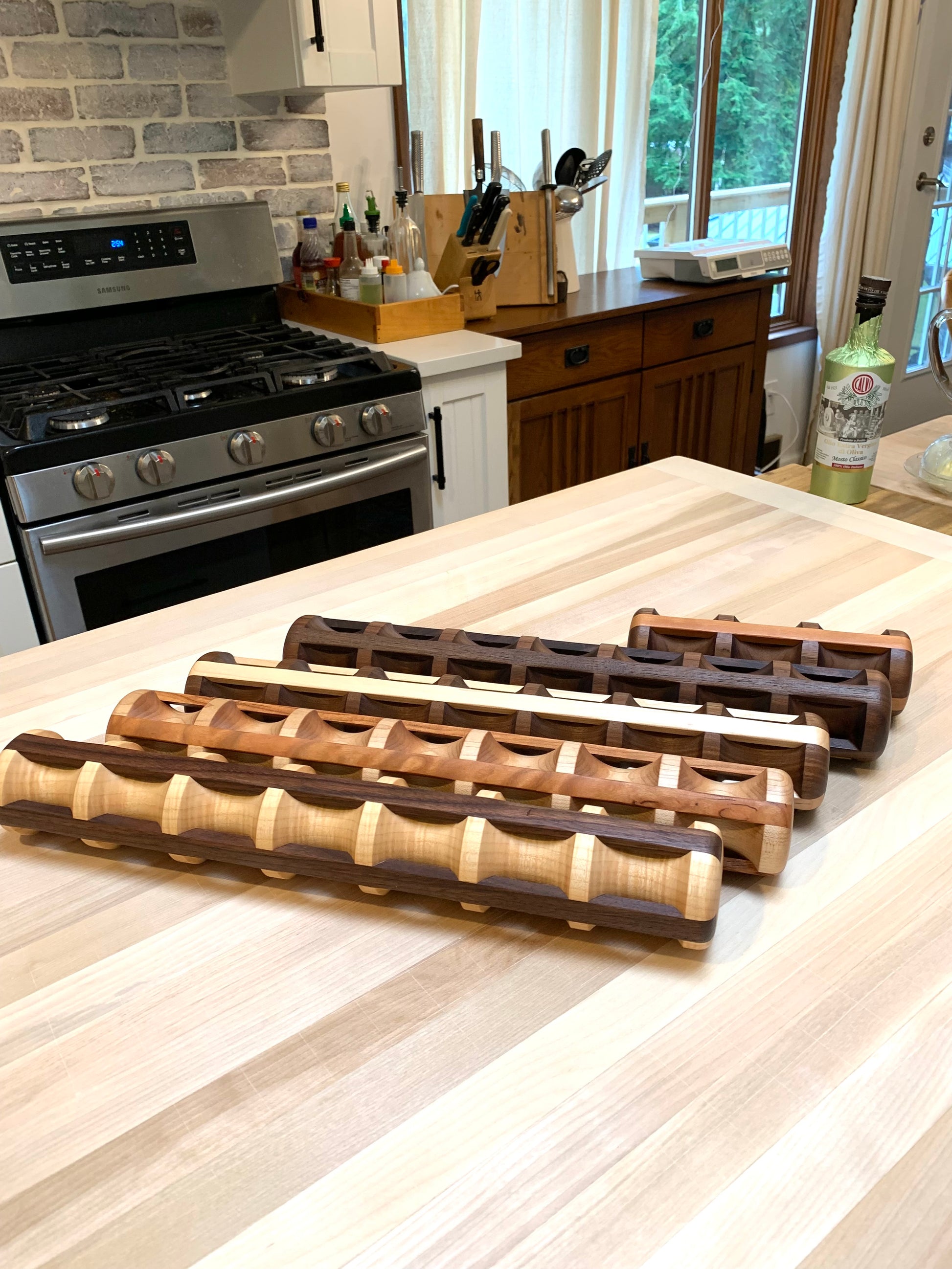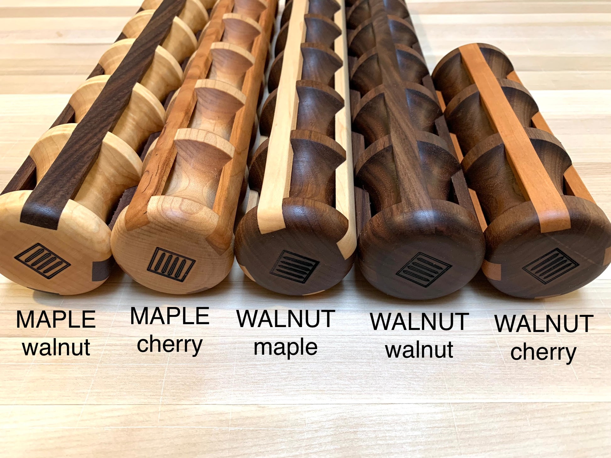Choose from a maple or walnut base, with inverted accent pieces. Available in Large -7pc and Small -3pc wide.